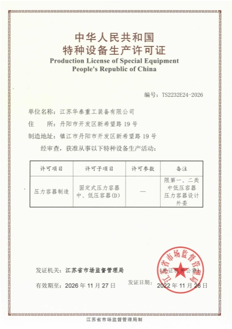 ◆ A2級壓力容器生產許可證 ◆