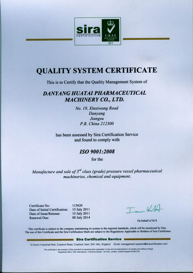 近日,丹陽市華泰制藥機械有限公司順利通過ISO9000認證,此舉不僅是對丹陽市華泰制藥機械有限公司數(shù)年來工作的肯定,更是對于我們公司的未來成長壯大的一種鞭策。
